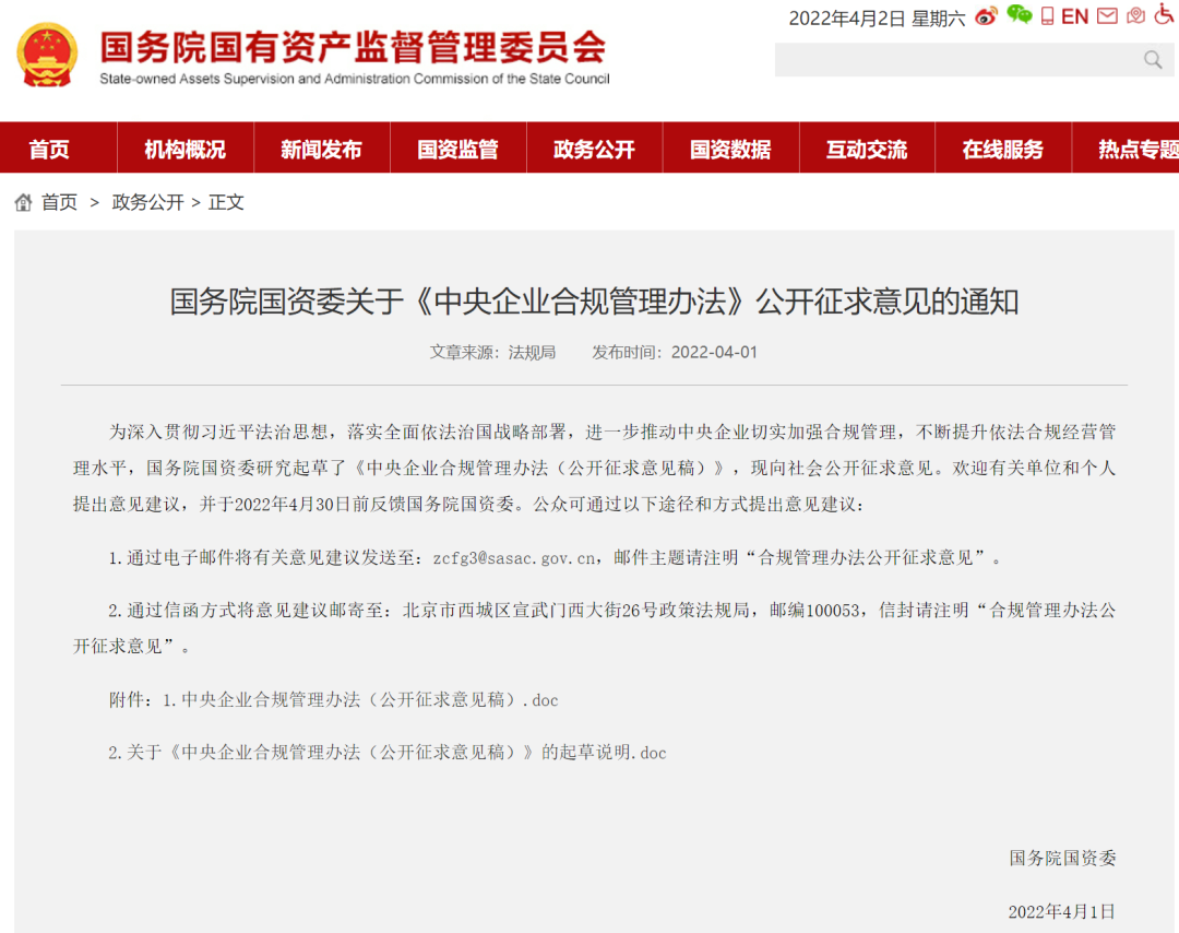 進(jìn)一步推動(dòng)中央企業(yè)切實(shí)加強(qiáng)合規(guī)管理,不斷提升依法合規(guī)經(jīng)營管理水平,4月1日,國務(wù)院國資委對(duì)外發(fā)布《中央企業(yè)合規(guī)管理辦法(公開征求意見稿)》(以下簡稱《辦法》),并向社會(huì)公開征求意見。
