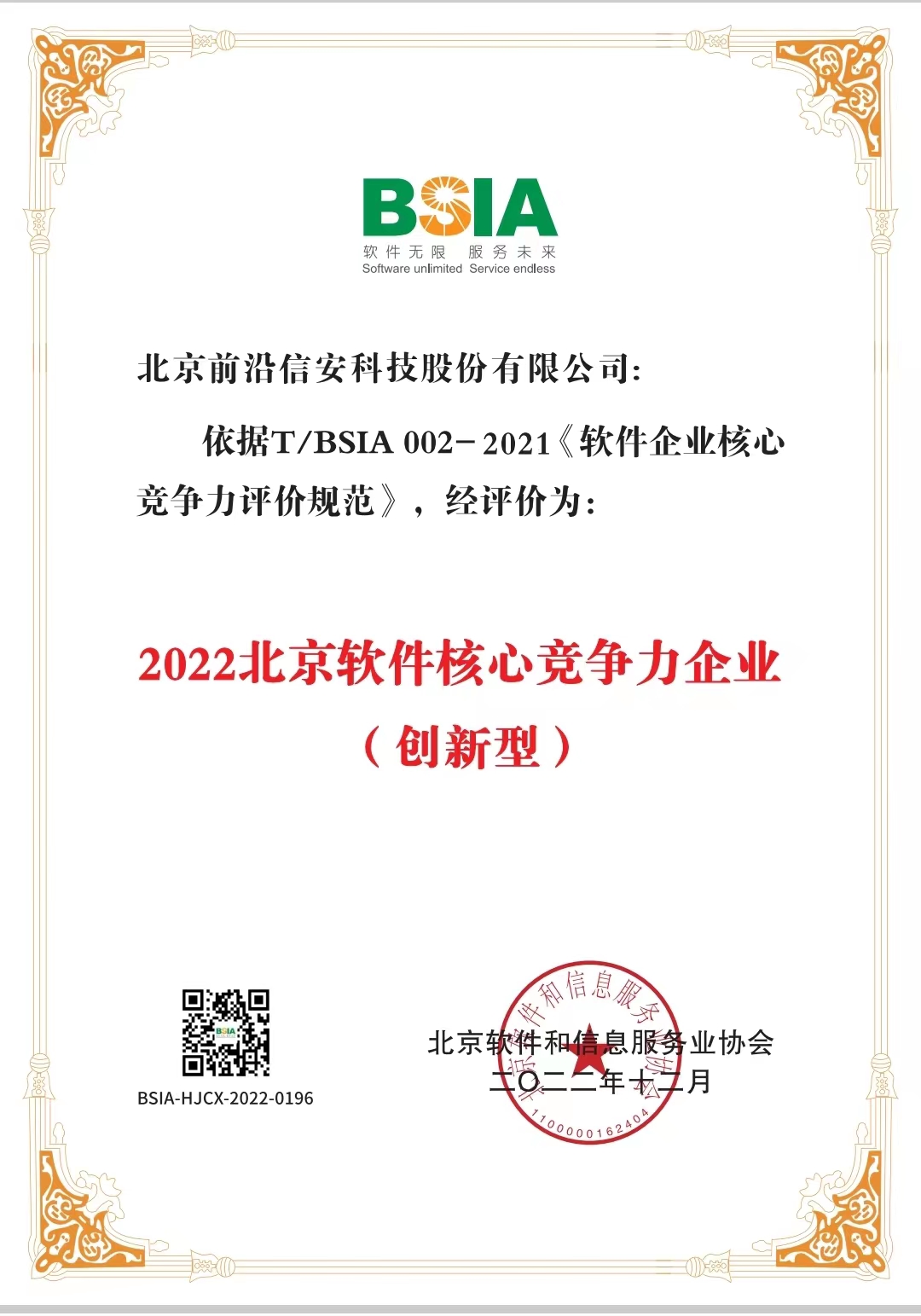 2022年12月,依據(jù)T/BSIA 002-2021《軟件企業(yè)核心競爭力評(píng)價(jià)規(guī)范》前沿信安取得了2022北京軟件核心競爭力企業(yè)(創(chuàng)新型)認(rèn)定證書