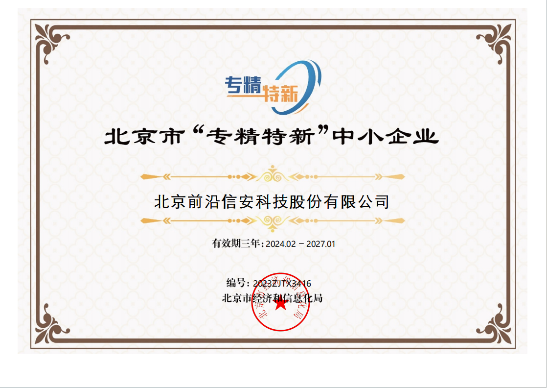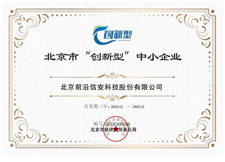 2023年4月,按照工業(yè)和信息化部《優(yōu)質(zhì)中小企業(yè)梯度培育管理暫行辦法》(工信部企業(yè)〔2022〕63號(hào))、《北京市優(yōu)質(zhì)中小企業(yè)梯度管理實(shí)施細(xì)則》要求,前沿信安取得了2023年北京市“創(chuàng)新型”中小企業(yè)認(rèn)定證書。